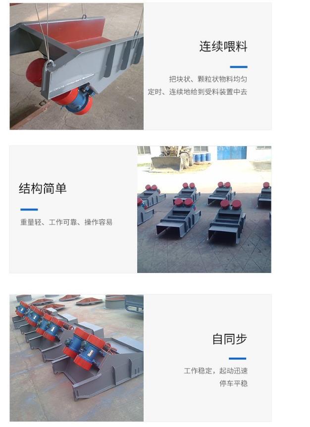 3、該機(jī)結(jié)構(gòu)簡單,振動平穩(wěn),喂料均勻,連續(xù)性能好,激振力可調(diào);隨時改變和控制流量,操作方便;偏心塊為激振源,噪音低,耗電少,調(diào)節(jié)性能好,無沖料現(xiàn)象;若采用封閉式機(jī)身可防止粉塵污染。