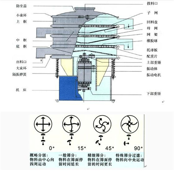 旋振篩是由直立式電機(jī)作激振源,電機(jī)上、下兩端安裝有偏心重錘,將電機(jī)的旋轉(zhuǎn)運(yùn)動轉(zhuǎn)變?yōu)樗?、垂直、傾斜的三次元運(yùn)動,再把這個運(yùn)動傳遞給篩面。通過調(diào)節(jié)上、下兩端的相位角,可以改變物料在篩面上的運(yùn)動軌跡,通過增減振動電機(jī)上下兩端的偏心重錘配重塊重量可以增加和減少震動幅度。