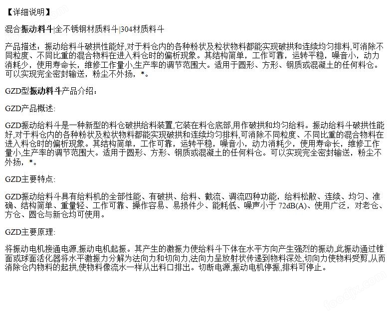 將振動由機接通由源攝動由機起振。且產生的激振力使給料斗下體在水平方向產生強列的振動此振動通過錐面或球面活化器將水平激振力分解為法向力和切向力法向力呈放射狀傳遞到物料深處切向力使物料受剪從而消除倉內物料的起拱使物料像流水一樣從出料口排出。切斷電源振動電機停振排料可停止。