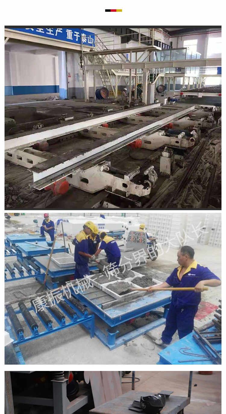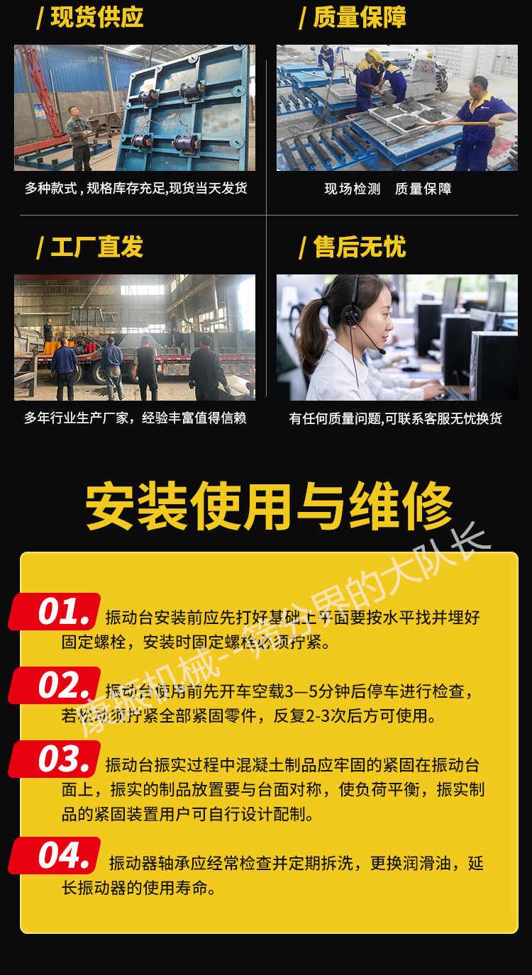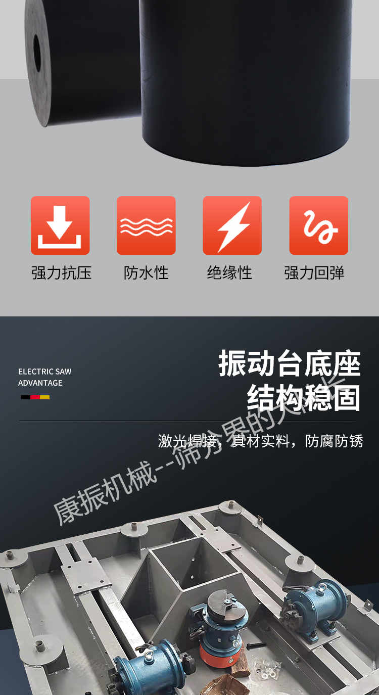 3、 振動臺在振實過程中,混凝土制品應牢固的緊固在振動臺面上,所需振實的制品放置要與臺面對稱,使負荷平衡,振實制品的緊固裝置。用戶可根據自己的需求自行設計配制。