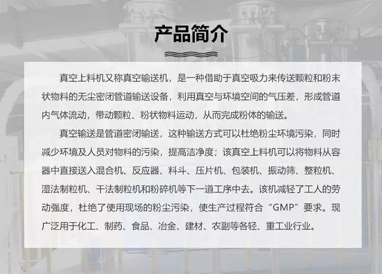 ZKS系列真空上料又稱真空輸送機,是通過氣體產生真空輸送粉體料的設備,是氣體輸送的一種。適用于醫藥、食品、化工、冶金、建材等多個行業,針對各種粉體物料的密閉輸送,提高物料的潔凈度,能滿足不同客戶的多種輸送需要。